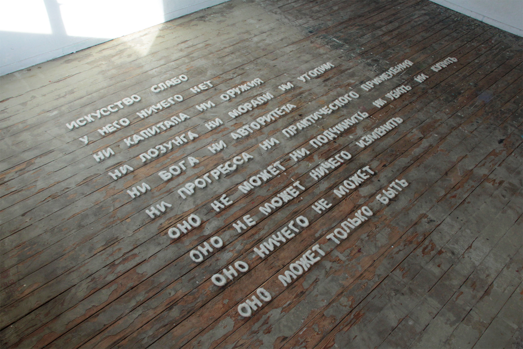 Here, the materialization on a human scale of an openly polemical text is not intended to create a consensus. On the contrary, it is a confrontation, due to the very nature of the text - negative, resulting from the repetitive presence of the articles do not, not, nor. However, this work is also an invitation to debate, asserting that art is anything but the things stated, and above all, that art is not a negation. ART CAN ONLY EXIST and existence cannot be negative, it is necessarily positive, proactive.