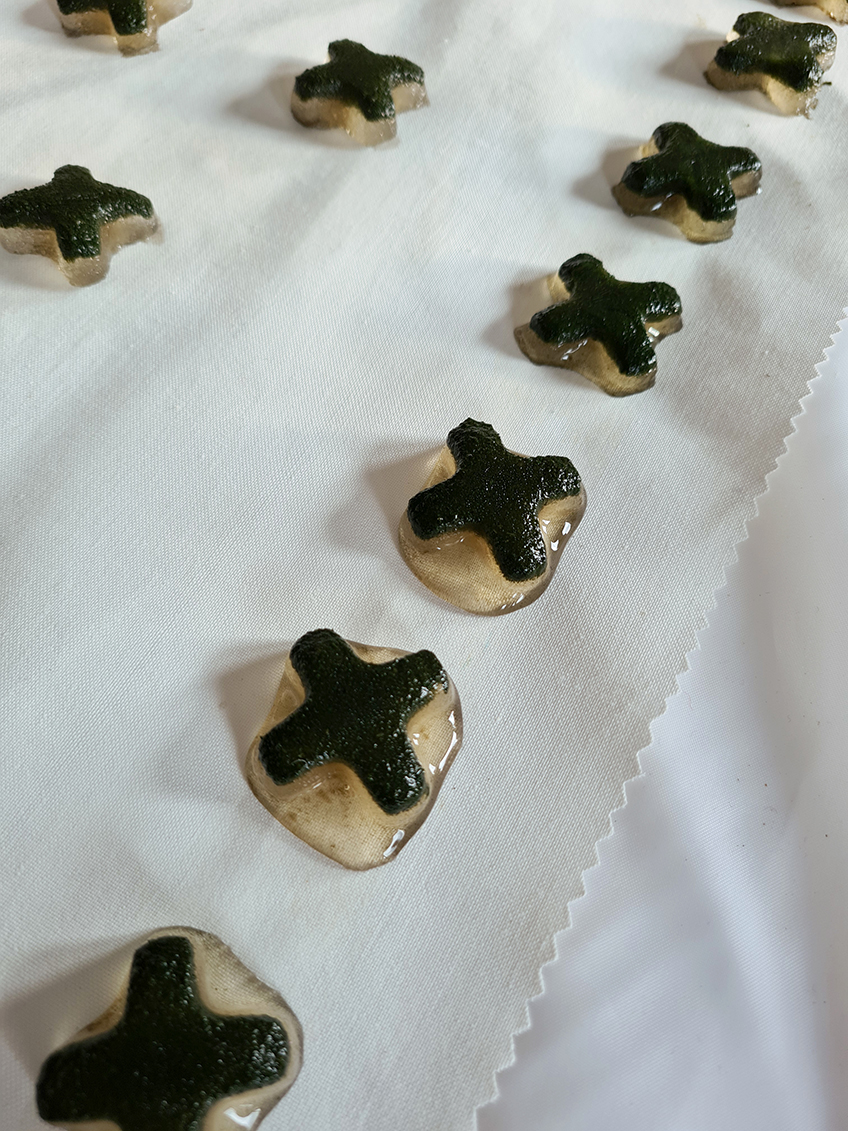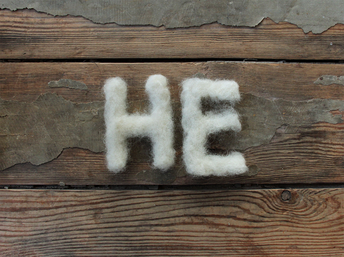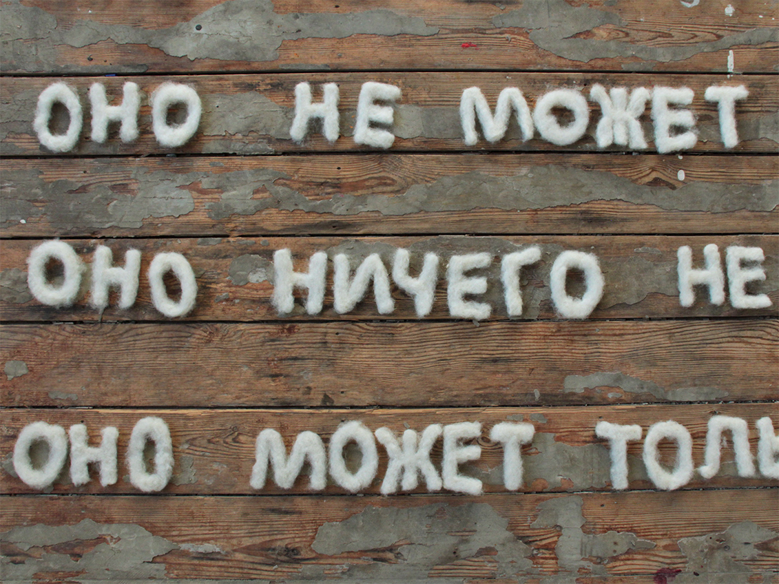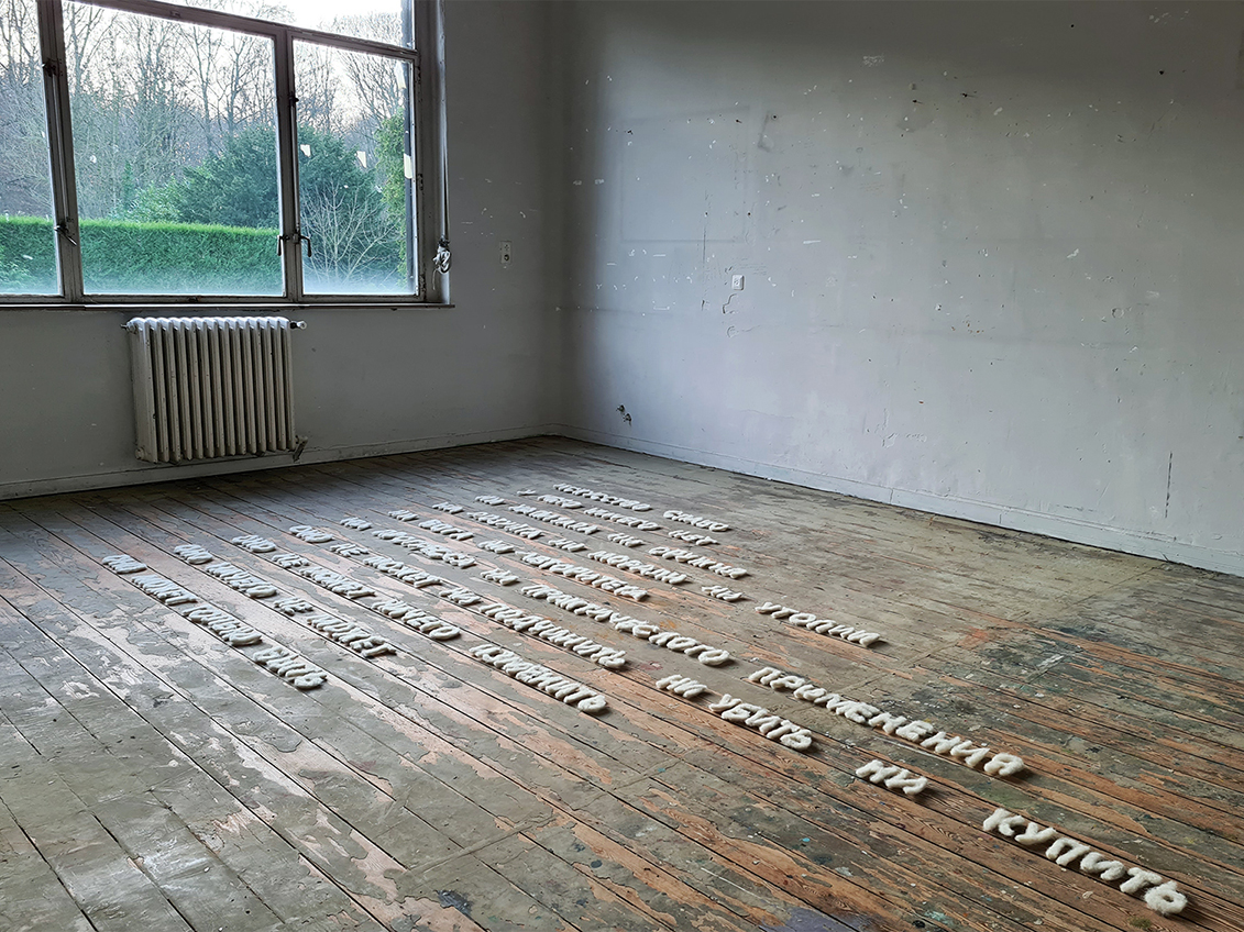 The installation 400 grams of wool, 20 needles, 265 letters, 22 hours of work is made of carded wool and is worked by hand with a needle. The title refers to this investment.