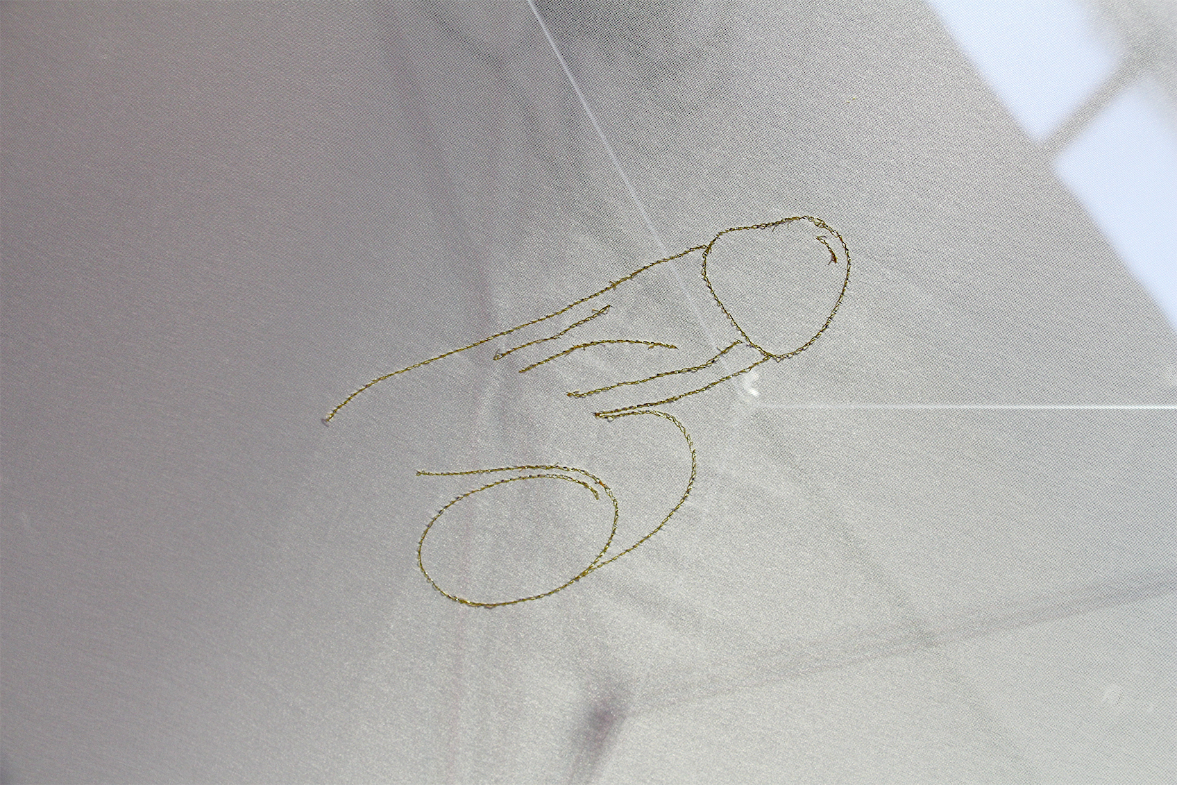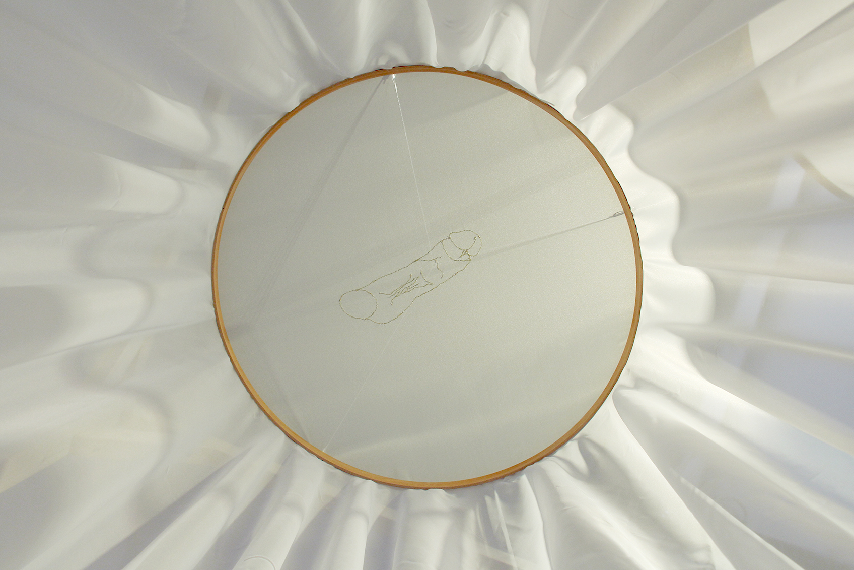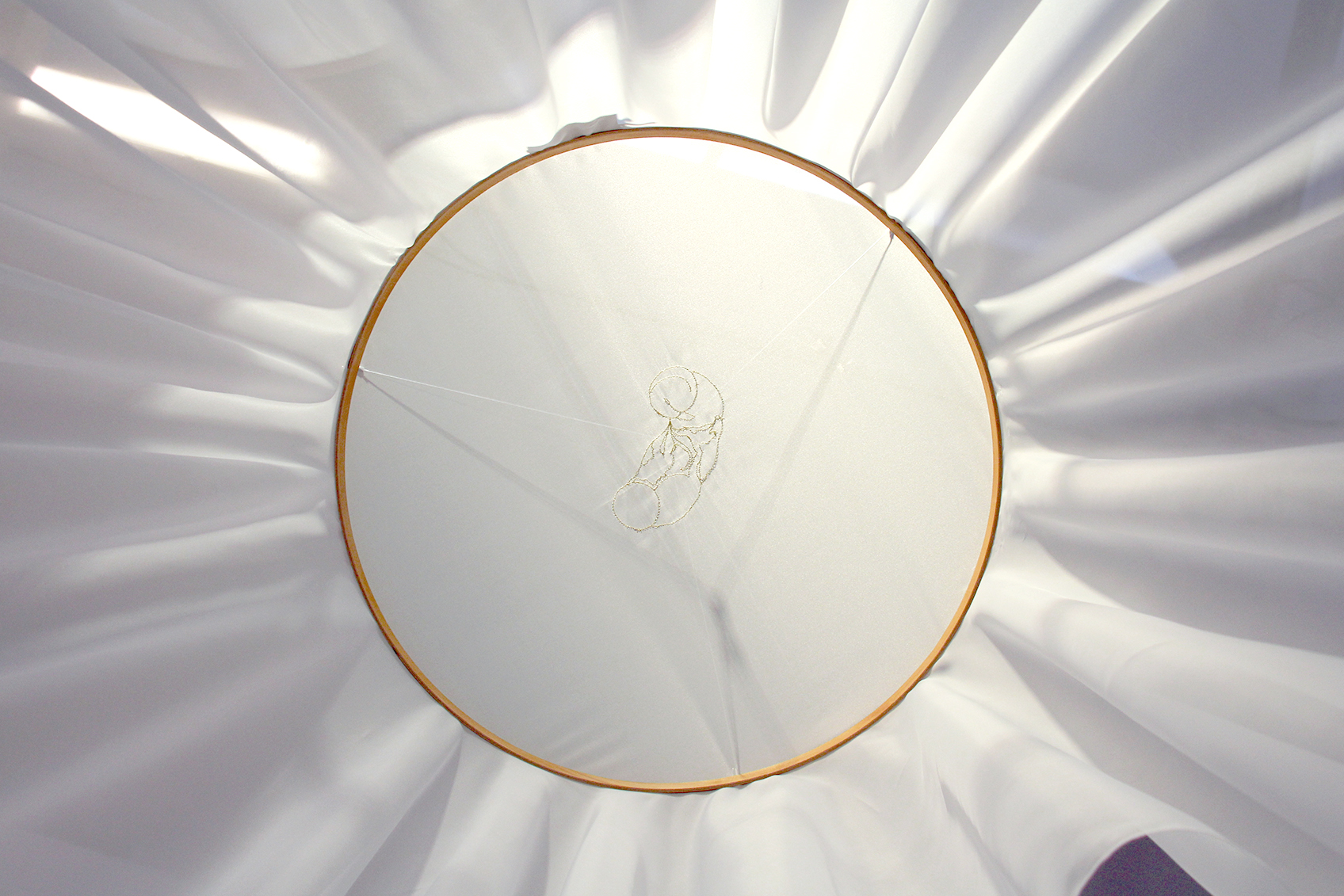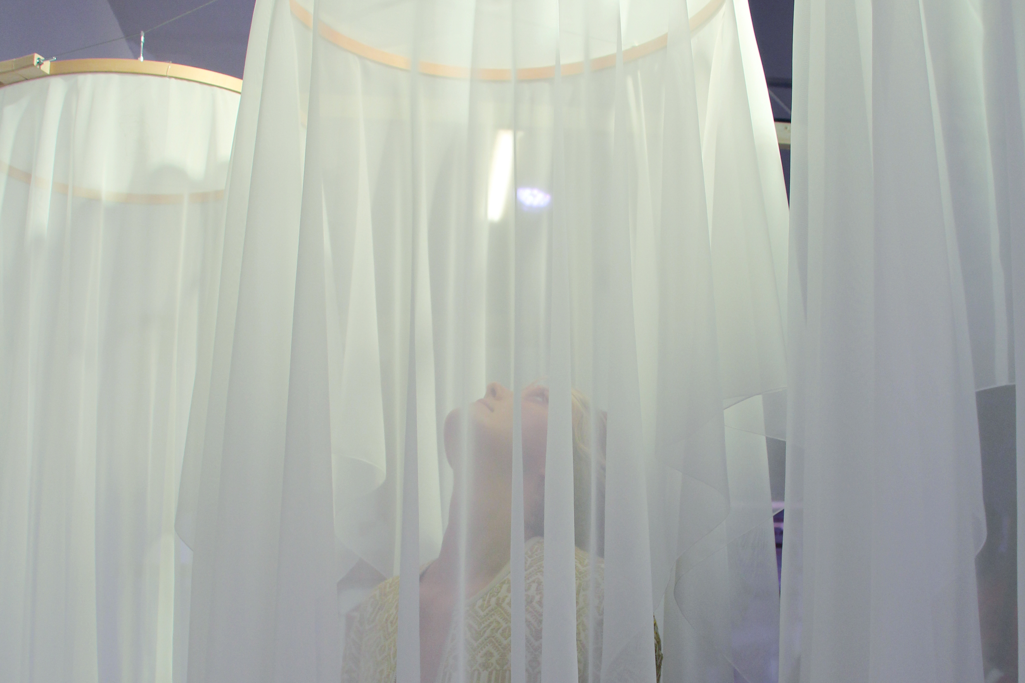 Three large embroidery hoops are hung high. The fabric escapes from the hoop, falls to the ground and becomes a vaporous refuge. Is it a cradle ? the bride's veil ? a fluid ?