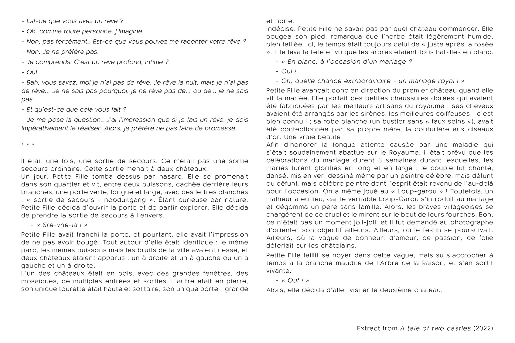 The tales of a little strawberry seller are both a collection of the tales and the performed reading that accompanies them. Here you can see an extract of The tale of two castles where everything is true (or almost) : two castles, two weddings, the war, a weak and alcoholic little girl, an emergency exit.