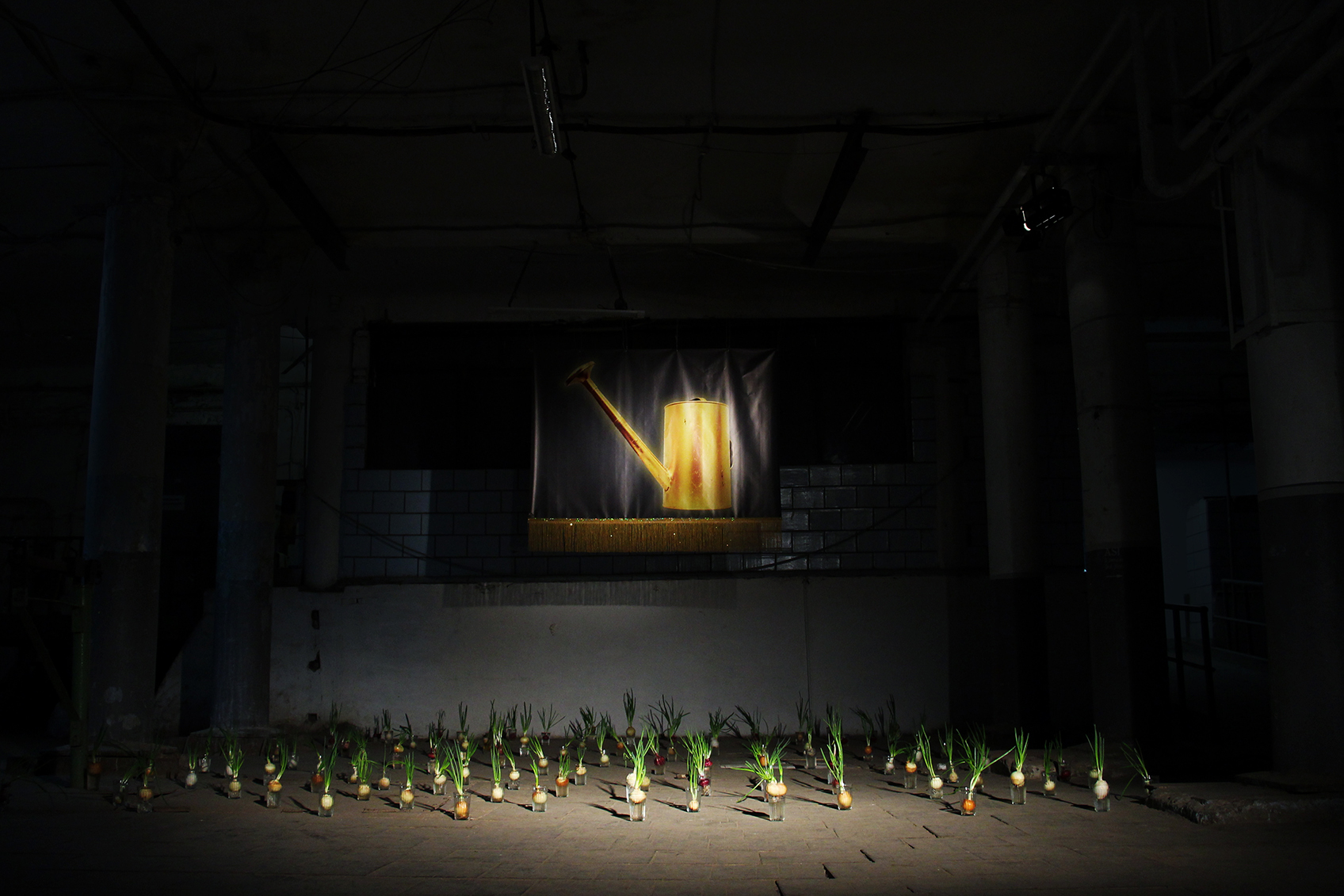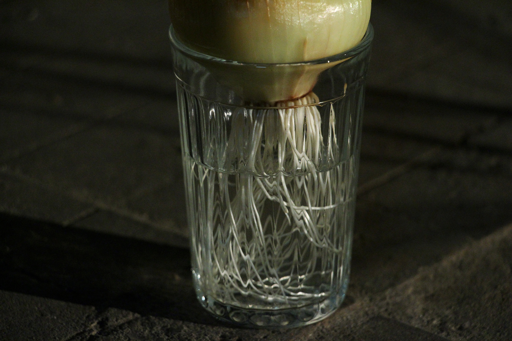 Place an onion in a glass of water and watch it grow, is a popular winter habit in some Eastern European countries. Here, a hundred onions are born, grow, put down roots and die under the watchful eye of a golden watering can.