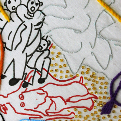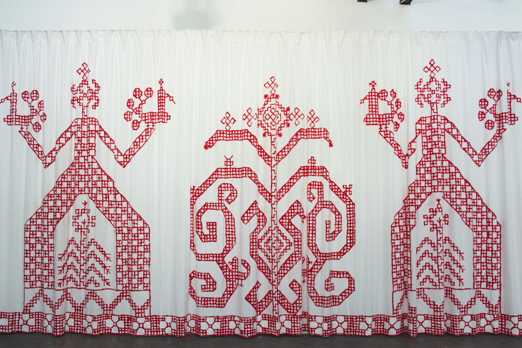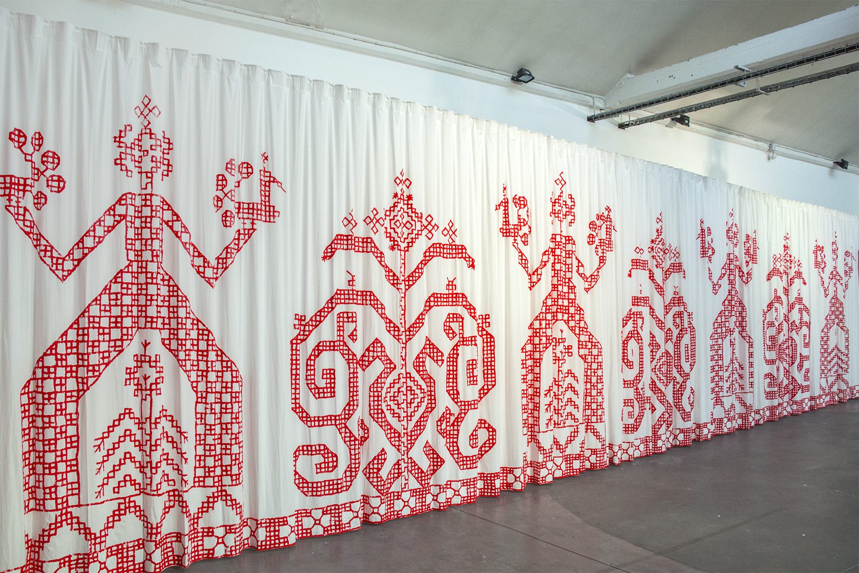 The embroidery motifs, usually of modest size, are presented here as subjects of historical, heroic and picturesque painting, on a monumental drape. This change of scale operates a change of status, of perception, perhaps even of value.