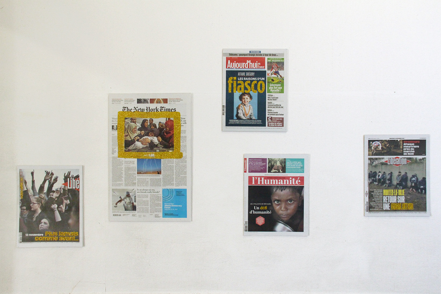 This series of collages is made from the front pages of French and international magazines and newspapers.