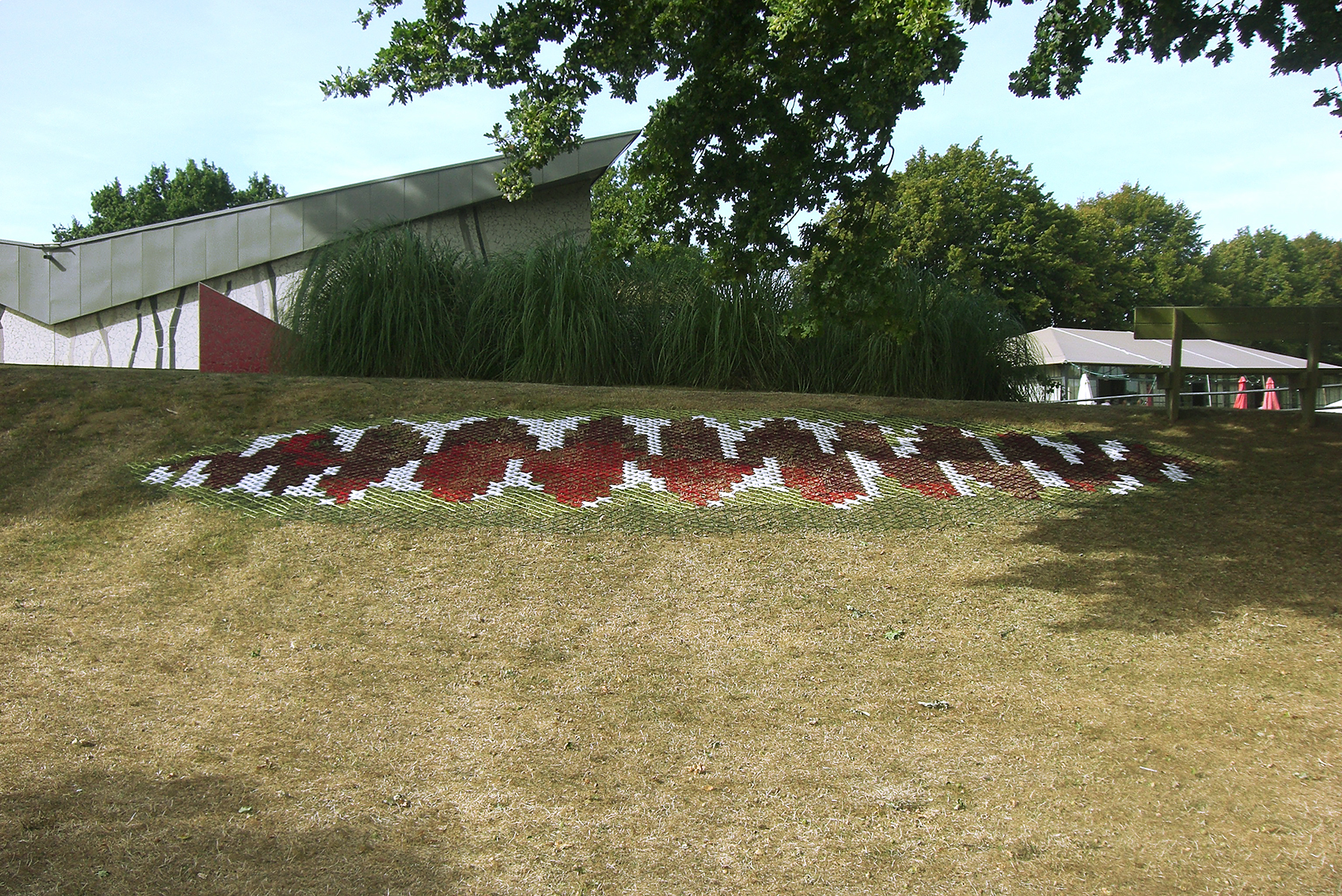 In a paradisiacal place, on a well arranged hill, a carnivorous plant - Venus flytrap, has been embroidered in place of a well-behaved flower.