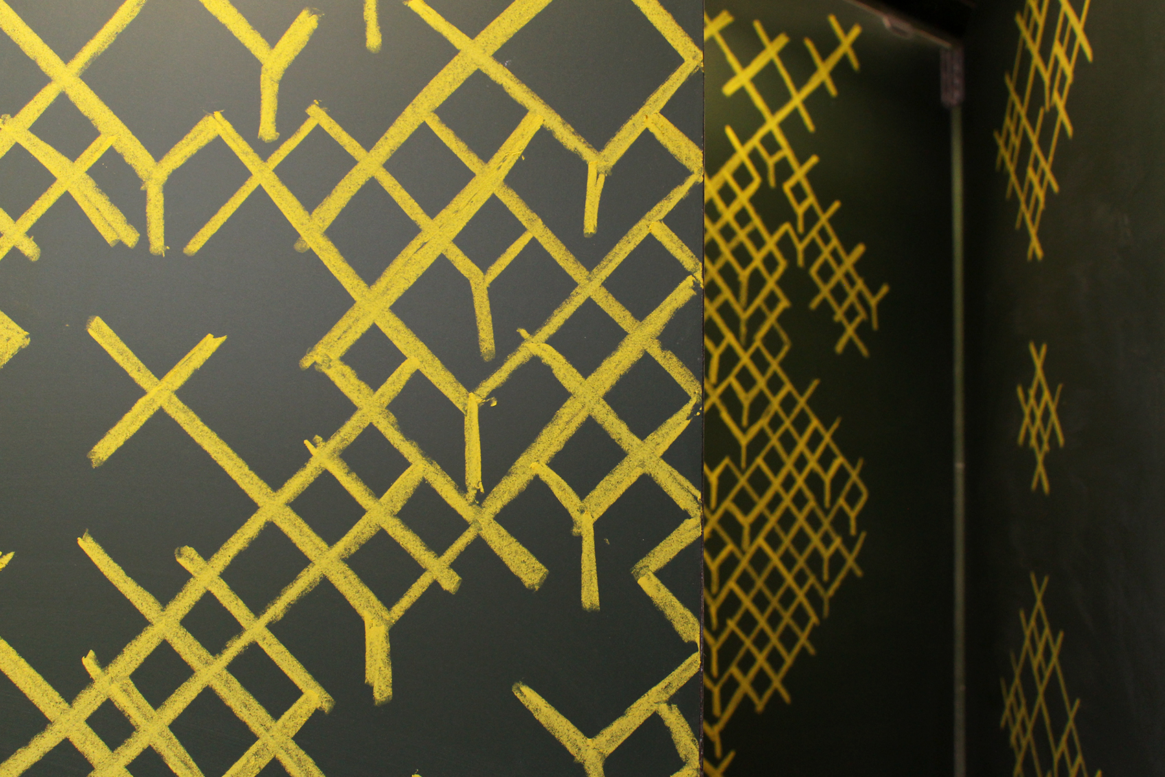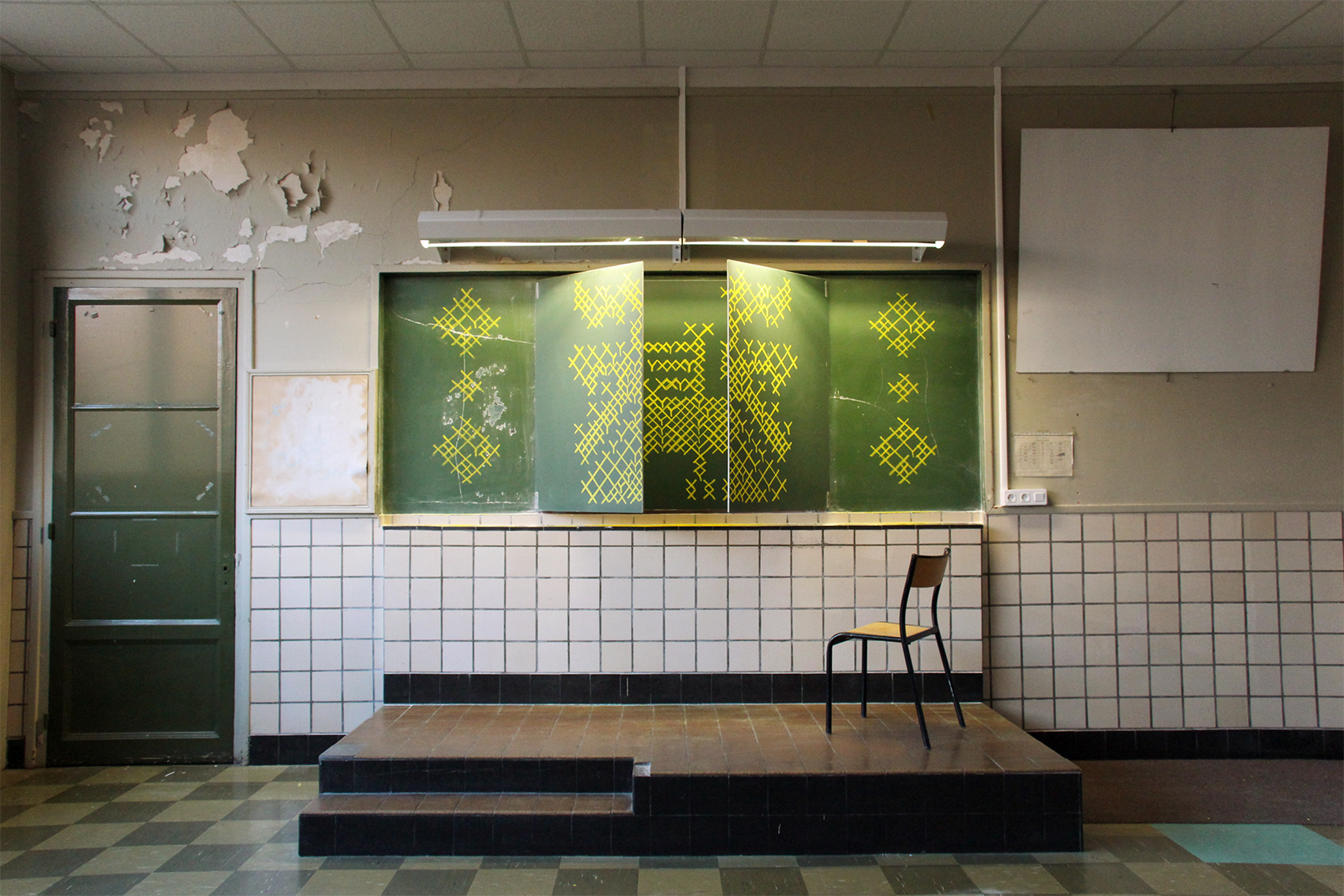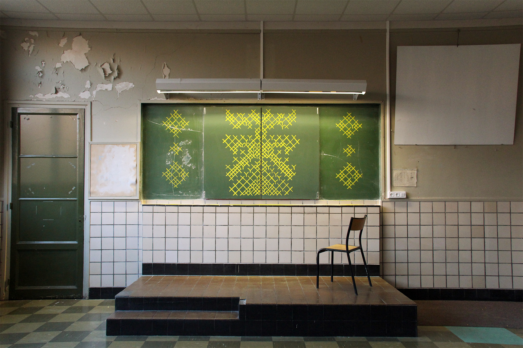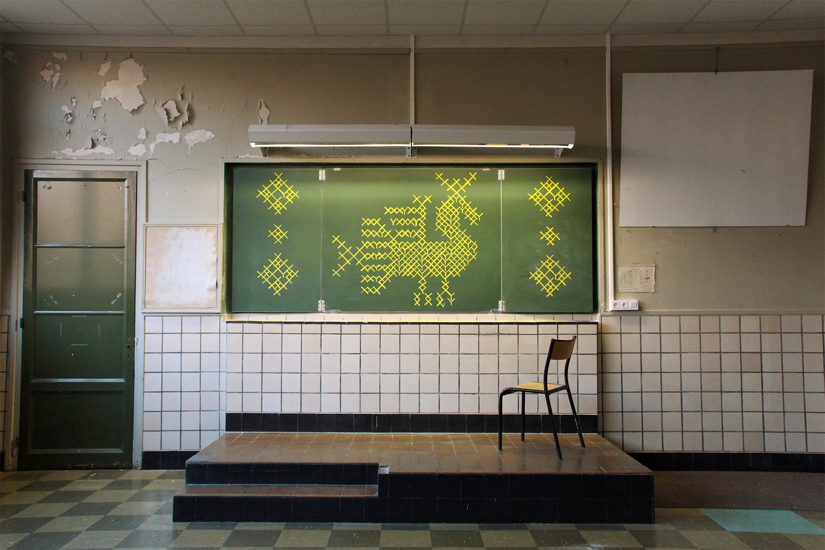 Drawing according to cross-stitch style, yellow chalk